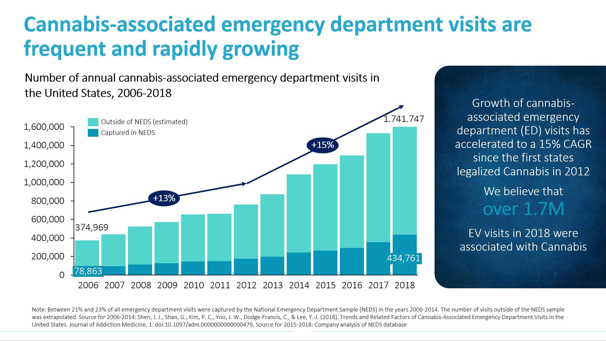 Source for 2006-2014: Shen, J. J., Shan, G., Kim, P. C., Yoo, J. W., Dodge-Francis, C., & Lee, Y.-J. (2018). Trends and Related Factors of Cannabis-Associated Emergency Department Visits in the United States. Journal of Addiction Medicine, 1. doi:10.1097/adm.0000000000000479, Source for 2015-2018: Company analysis of NEDS database.