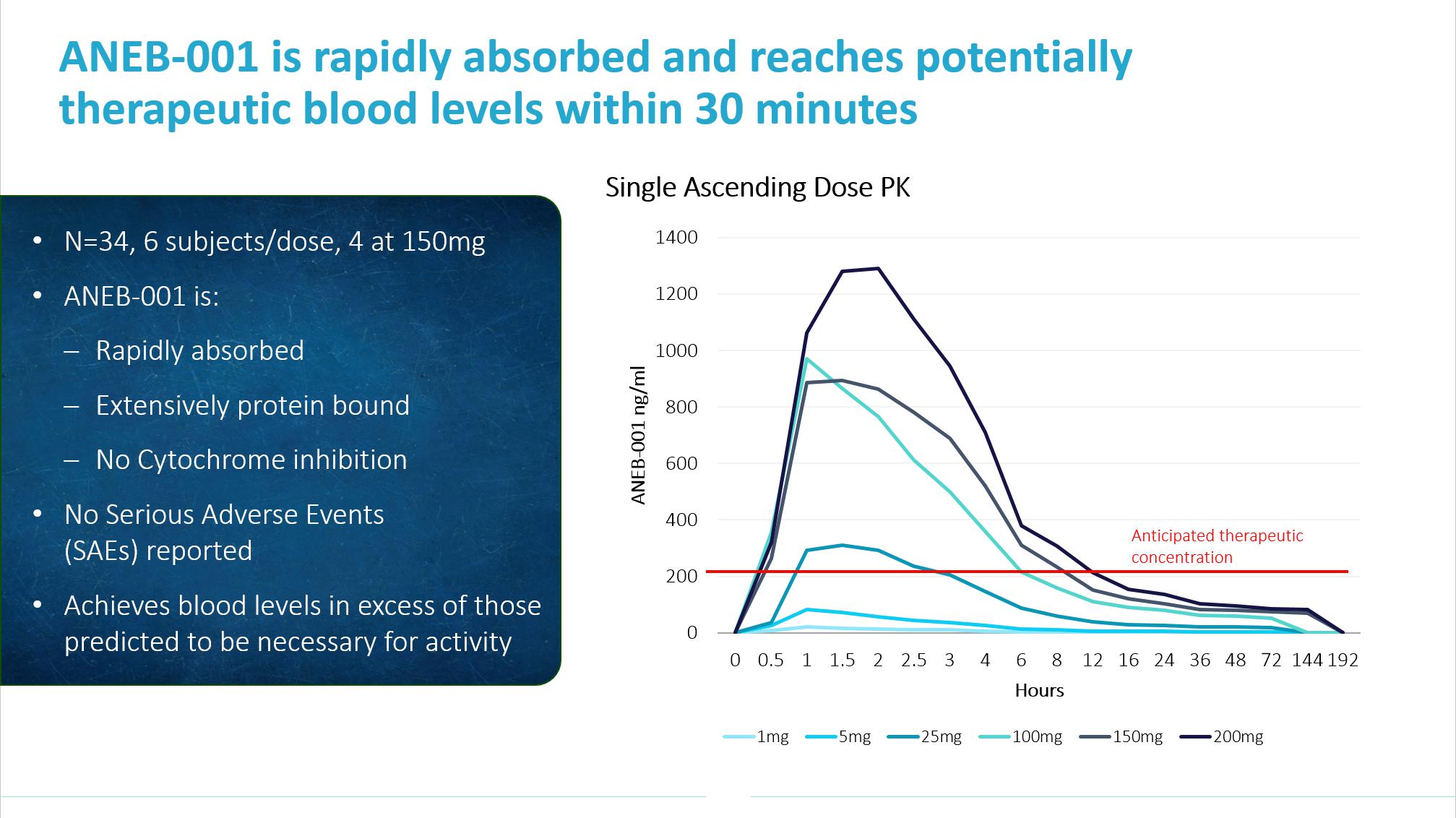 The Phase 1a study administered single (Part A) and multiple (Part B) ascending doses of ANEB-001 for up to 14 days in healthy volunteers.
