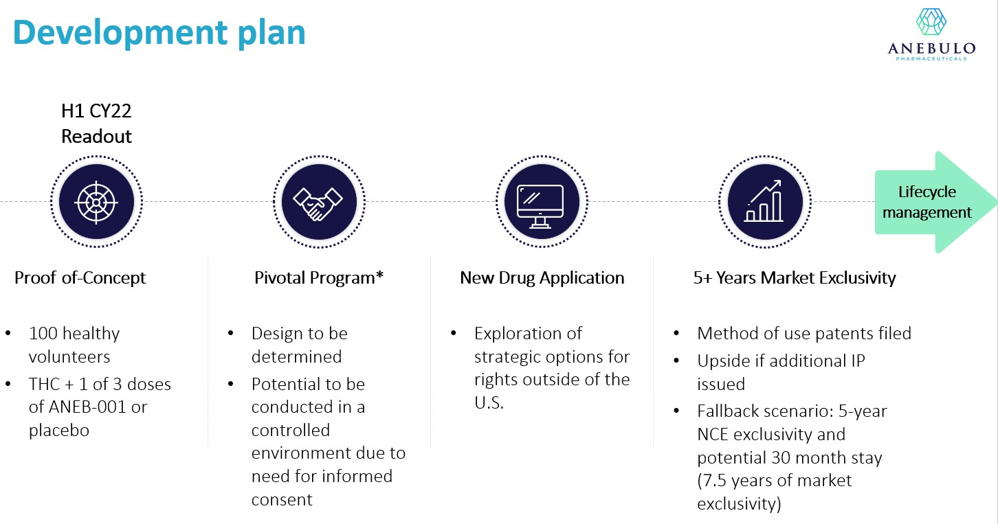 Our objective is to develop and commercialize new treatments options for patients suffering from addiction. Our lead product candidate is ANEB-001, a potent, small molecule cannabinoid receptor antagonist, to address the unmet medical need for a specific antidote for ACI. ANEB-001 is an orally bioavailable, rapidly absorbed treatment that we anticipate will reverse the symptoms of ACI, in most cases within 1 hour of administration. Our proprietary position in the treatment of ACI is protected by rights to two patent applications covering various methods of use of the compound and delivery systems. We anticipate starting our first Phase 2 trial for ANEB-001 in the fourth calendar quarter of 2021.