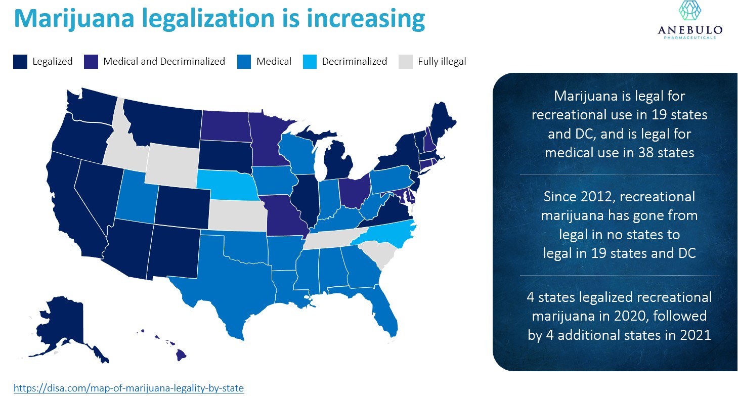 We are a clinical-stage biotechnology company developing novel solutions for people suffering from acute cannabinoid intoxication (“ACI”) and substance addiction. Our lead product candidate, ANEB-001, is intended to reverse the negative effects of ACI within 1 hour of administration. The signs and symptoms of ACI range from profound sedation to anxiety and panic to psychosis with hallucinations. There is no approved medical treatment currently available to specifically alleviate the symptoms of ACI and we are not aware of any competing products that are further along in the development process than ANEB-001 in reversing the effects of tetrahydrocannabinol (“THC”), the principal psychoactive constituent of cannabis. Clinical trials completed to date have shown that ANEB-001 is rapidly absorbed, well tolerated and leads to weight loss, an effect that is consistent with central CB1 antagonism. In March 2021, our European clinical trial applications (which is equivalent to an investigational new drug application in the United States) was accepted in the Netherlands to allow us to utilize ANEB-001 in a Phase 2 proof-of-concept trial for ACI planned for the fourth quarter of 2021.