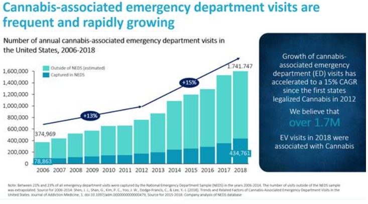 ACI frequently occurs due to the ingestion of edibles, which can contain relatively large amounts of THC, and consumption of synthetics. Symptoms of ACI produced by edibles and synthetics can include psychosis, panic and anxiety, feelings of paranoia, agitation, hallucinations, nausea, vomiting, cardiac arrhythmias, seizures and death. These symptoms can require emergency medical attention and can take hours to days to resolve. According to an article published in the Journal of Addiction Medicine that analyzed data from NEDS, an estimated 1.1 million emergency department visits were associated with cannabis in 2014. We have performed our own independent analysis of all currently available NEDS datasets and estimated that the number of cannabis-associated emergency department visits increased to 1.74 million patients in 2018. The number of cannabis-associated emergency department visits has grown at a 15% compounded annual growth rate from 2012 to 2018, which is when states first began legalizing recreational cannabis use.