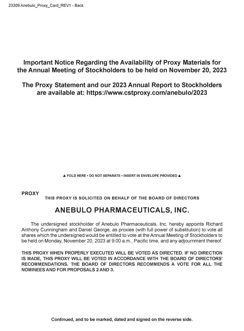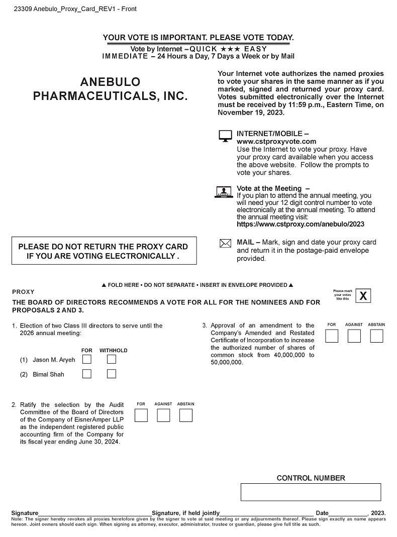 You are cordially invited to attend the Annual Meeting of Stockholders of Anebulo Pharmaceuticals, Inc., a Delaware corporation (the “Company”). The meeting will be held on Monday, November 20, 2023, at 9:00 a.m. (Pacific Time) via live webcast at https://www.cstproxy.com/anebulo/2023. The meeting will be held for the following purposes:
