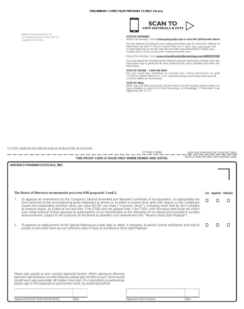 You are cordially invited to attend a special meeting of stockholders (the “Special Meeting”) of Anebulo Pharmaceuticals, Inc., a Delaware corporation (“Anebulo,” the “Company,” “we”, “us” or “our”), to be held virtually at www.virtualstockholdermeeting.com/ANEB2025SM on [●], 2025, at 9:00 a.m. (Central Time).