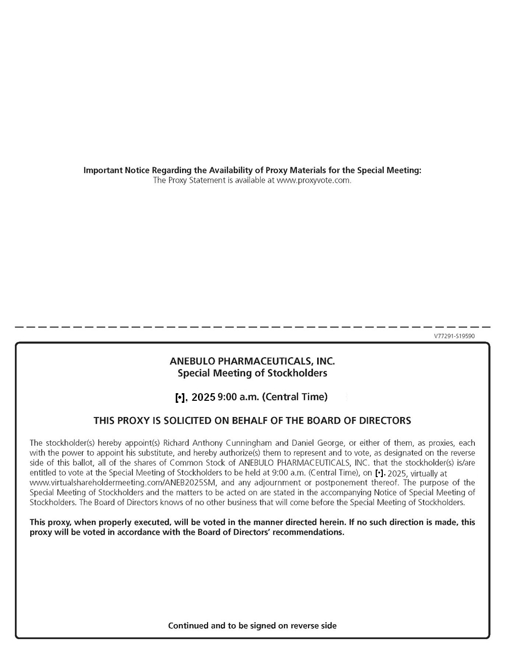 You are cordially invited to attend the special meeting of stockholders (the “Special Meeting”) of Anebulo Pharmaceuticals, Inc., a Delaware corporation (the “Company”). The meeting will be held on [●], 2025, at 9:00 a.m. (Central Time) via live webcast at www.virtualstockholdermeeting.com/ANEB2025SM. The meeting will be held for the following purposes: